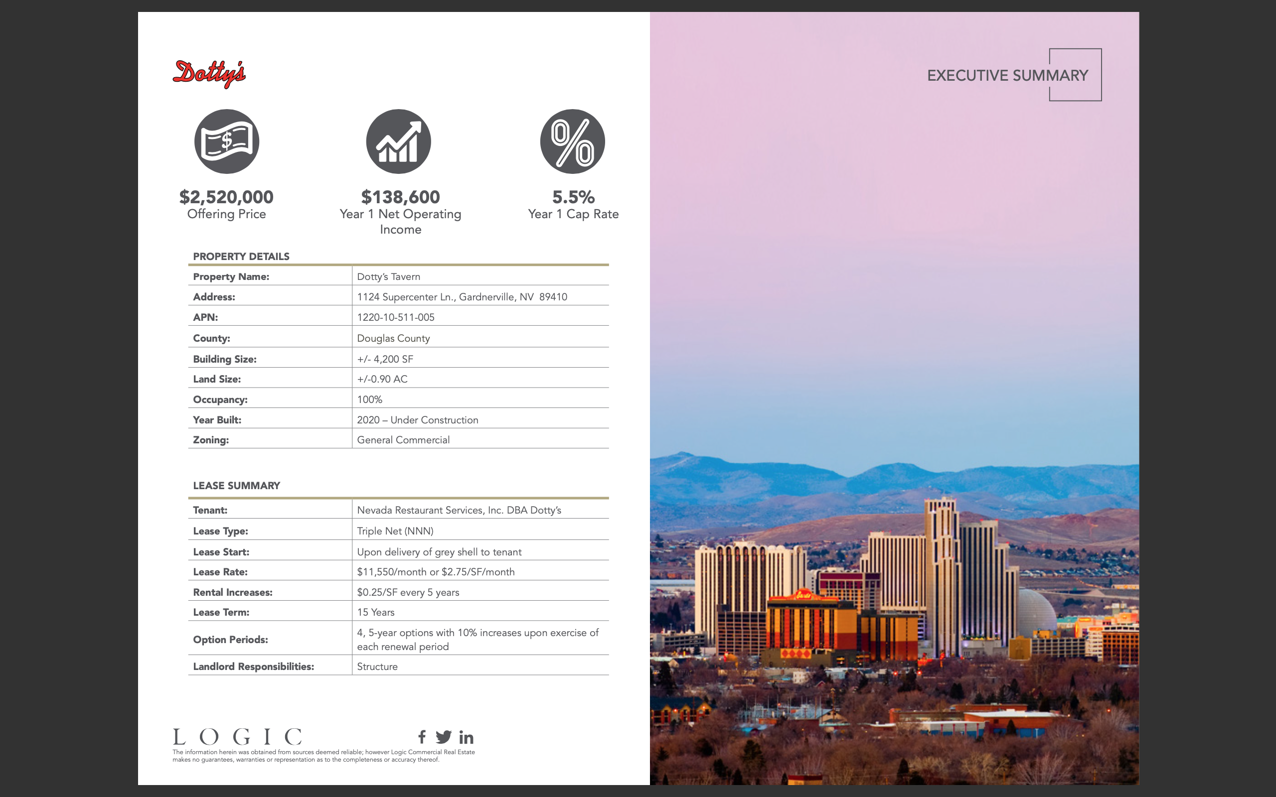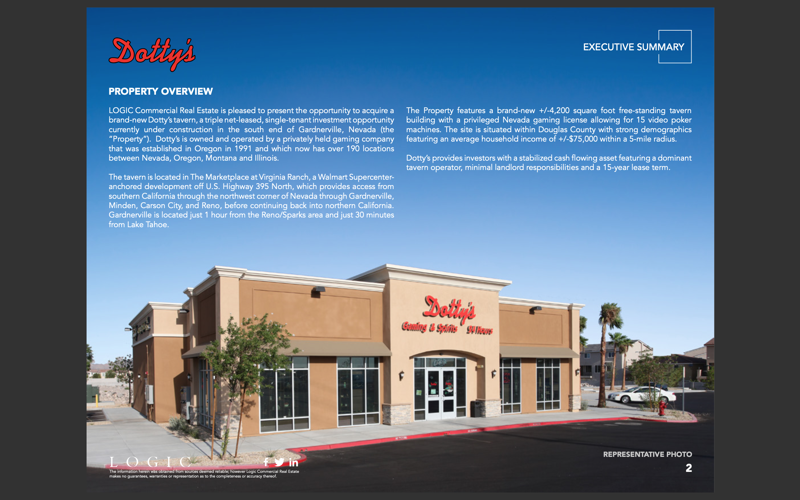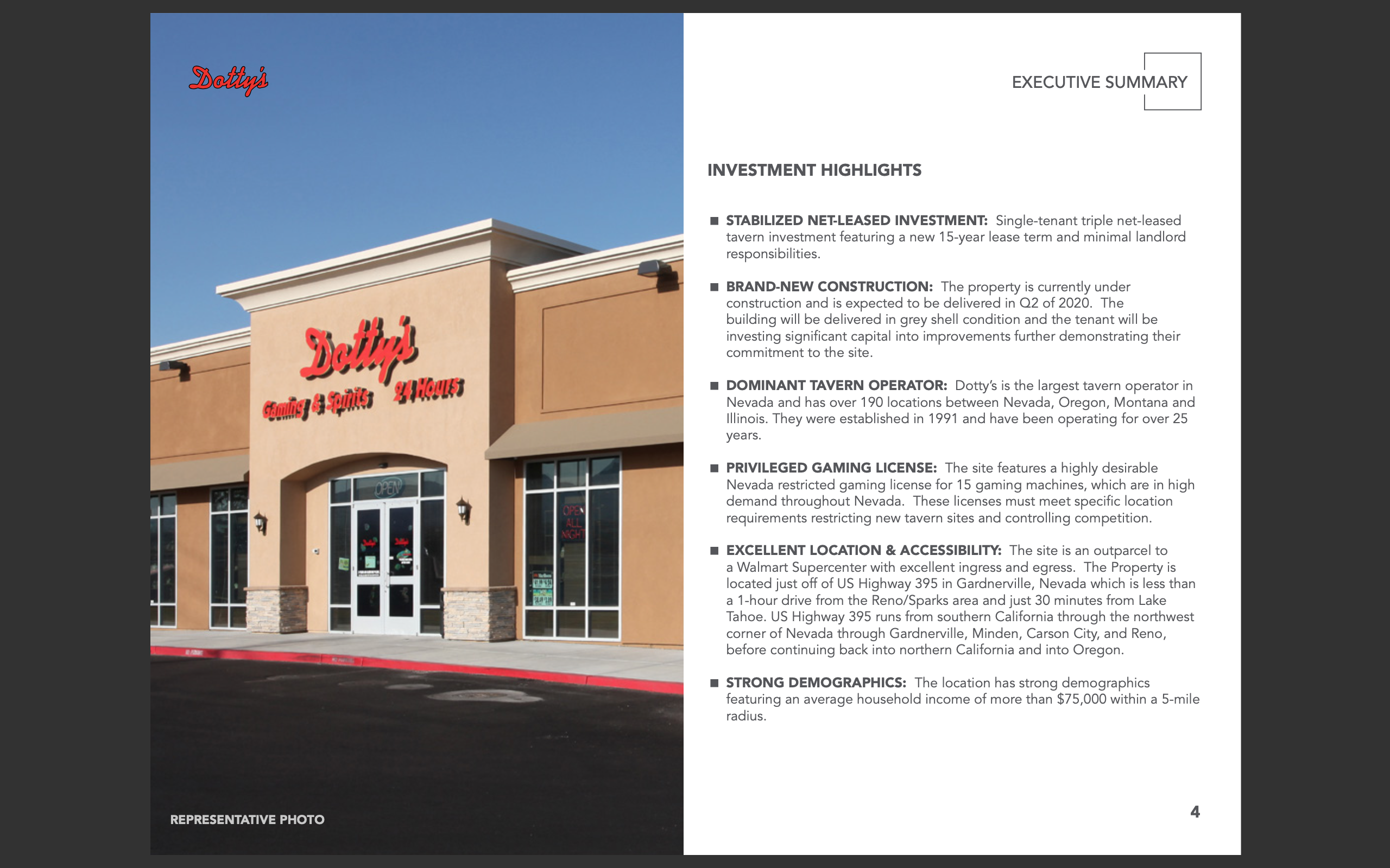 A brand new +/-4,200 square foot free-standing tavern builing with priviledged Nevada gaming license allowing for 15 video poker machines.